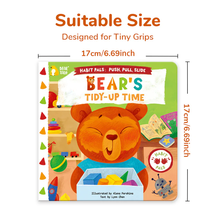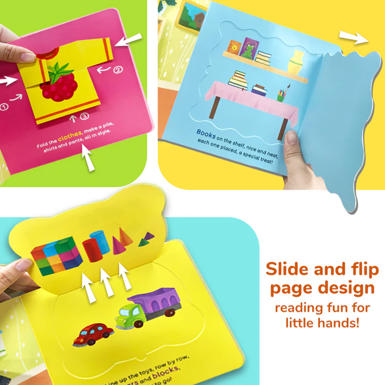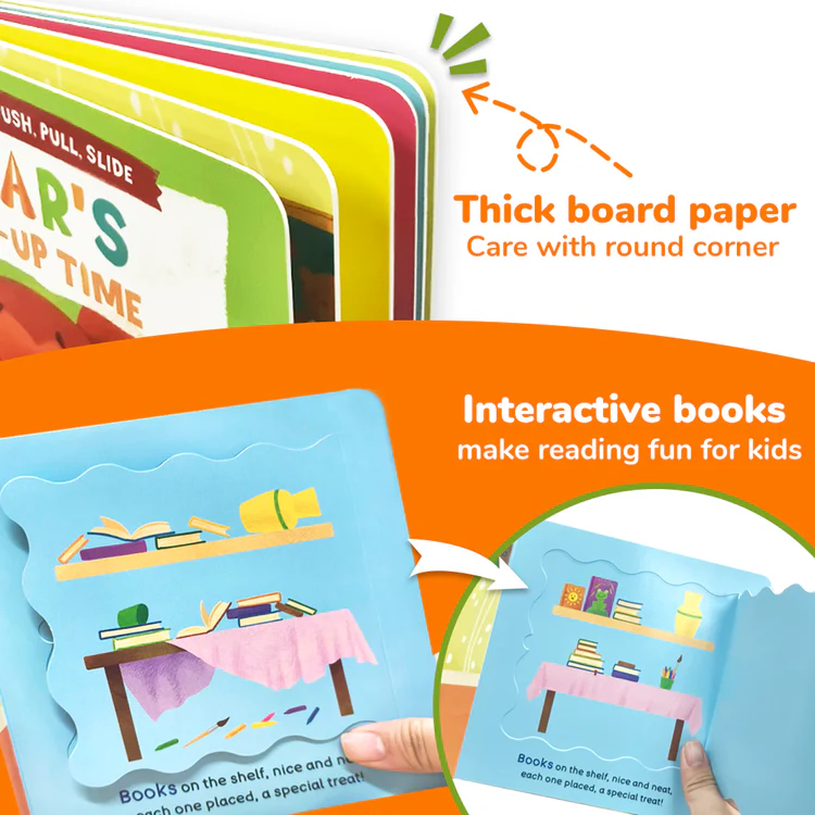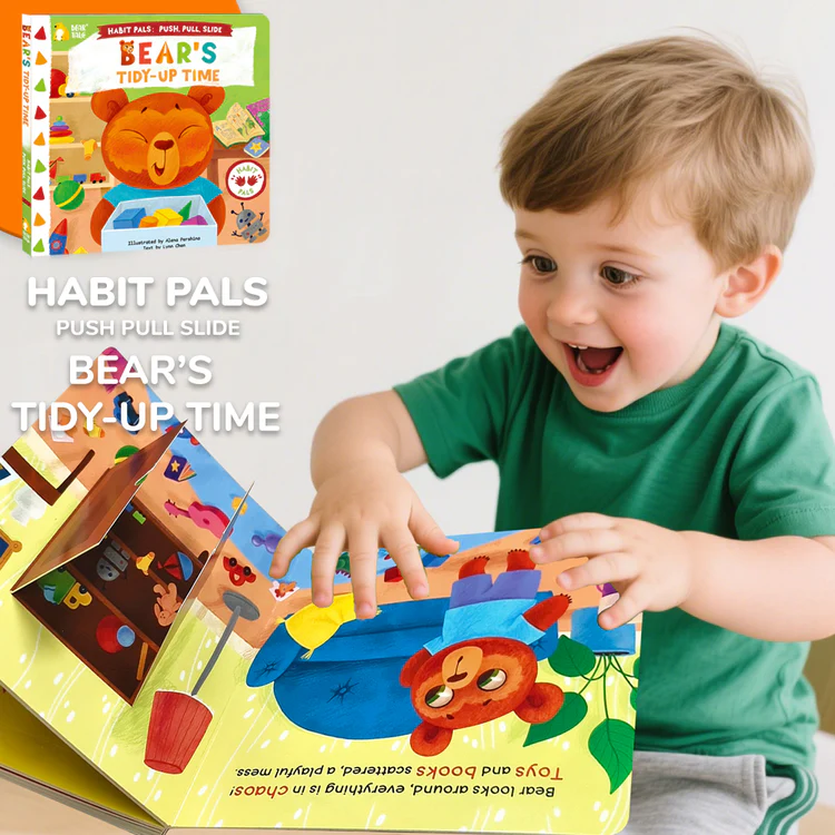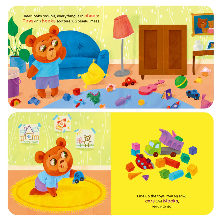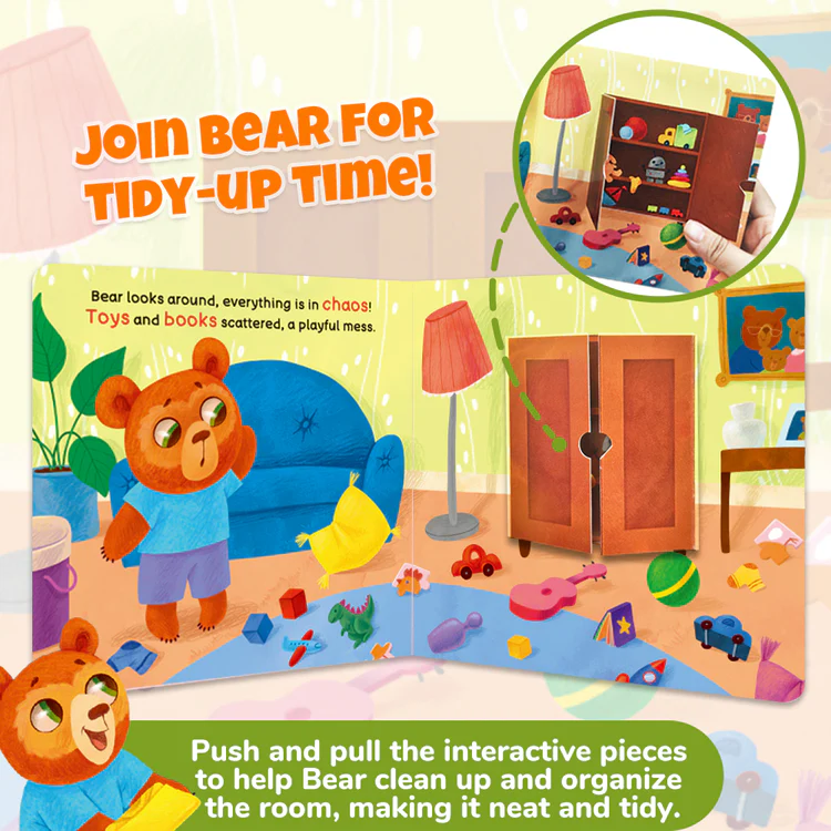 This engaging activity book follows Bear as he tidies up his room after playtime. With push, pull, and slide mechanisms on every page, children help Bear sort toys, fold clothes, and put things in their proper place. The book uses vivid illustrations and simple actions to reinforce positive habits like responsibility, cleanliness, and routine-building.