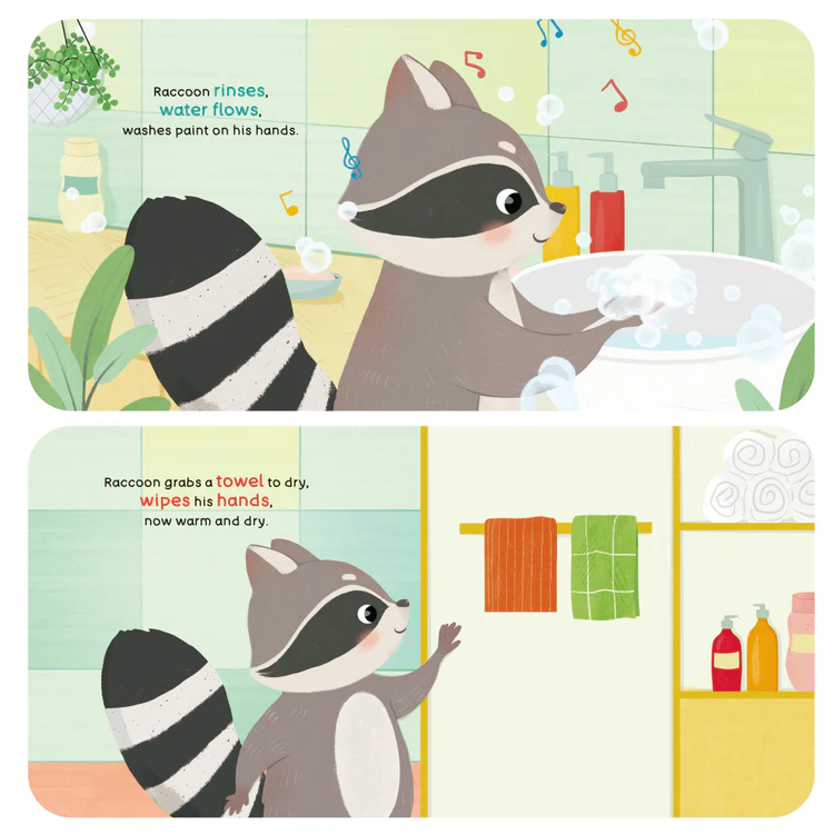 This engaging activity book follows Raccoon as he learns how to wash his hands properly. With push, pull, and slide mechanisms on every page, kids can help Raccoon turn on the faucet, lather soap, rinse, and dry—making the handwashing routine fun and memorable. The book uses vivid illustrations and simple actions to reinforce healthy habits and build fine motor skills.