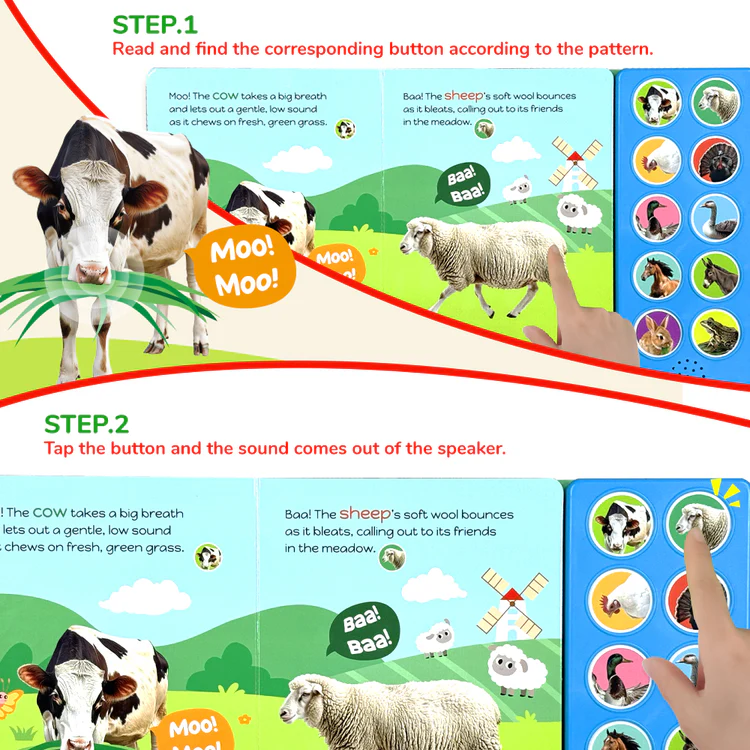 is a delightful interactive board book designed for young children. It introduces toddlers to the lively world of farm animals through colorful illustrations and engaging sound buttons. Each page features a different animal—like cows, pigs, and ducks accompanied by fun facts and realistic sounds that bring the farm to life.